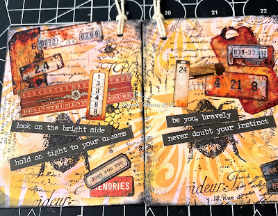 Love the tags, you do those grungey ones with the gorgeous backgrounds, stamping and ephemera so beautifully- wonderful warm golden colours on these. The black CAS one is fabulous too- very striking. Great sentiments on all 3!